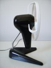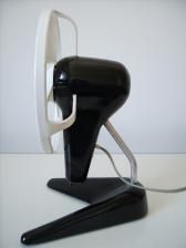 Baujahr: ca. 1960? Breite: ca. 20 cm, Tiefe: ca. 17,5 cm, Höhe: ca. 28,5 cm Flügeldurchmesser: ca. 18,5 cm, Gewicht: 0,94 kg Spannung: 220 V, Leistung: 25 W, Stufen: 2 Gehäusematerial: Motorgehäuse und Fuß aus schwarzem Kunststoff, Ständer aus Aluminium Bemerkung: 7020 4 Typ 1-2-2 Designikone! Der Ventilator wurde 1959 von dem Designer Hans Merz entworfen. Der Ventilator ist ein interessantes Beispiel für das Industriedesign der früheren DDR. Der Ventilator kann sowohl als Stand- als auch als Wandventilator verwendet werden. Der Ventilator wurde über einen längeren Herstellungszeitraum, nahezu unverändert, in zahlreichen Varianten produziert. Bisher bekannte Varianten: 7020 4 Typ 1-1-1 Blau, Grau, Schwarz, 7020 4 Typ 1-1-1 Schwarz V1, 7020 4 Typ 1-2-2, 7020 4-3 Typ 1-1-3, 7020 4-3 Typ 1-2-3, 7020 4-3 Typ 2-2-3, 7020 4-3 Typ 2-2-4. Bei der Typenbezeichnung handelt es sich um eine Zahlenkombination aus drei Zahlen z. Bsp. Typ 1-2-3 Die erste Zahl bezieht sich auf das Design der Lüftungsöffnungen, die zweite Zahl bezieht sich auf das Rotoren-Design und die dritte Zahl gibt Auskunft über das verwendete Typenschild. Merkmale: 7020 4-3 Typ 1-2-2: 1. Zahl = Lüftungsöffnungen: Kenn-Nr.: 1: Innerhalb einer Kreisfläche befinden sich mehrere parallel zueinander angeordnete, durchgehend gerade Lüftungsschlitze. 2. Zahl = Rotordesign: Kenn-Nr.: 2. Der Rotor besteht aus 3 Flügel. Um Verletzungen vorzubeugen, wird der Rotor durch einen separaten Schutzring umschlossen, der NICHT Teil des Rotors ist. 3. Typenschilder: Kenn-Nr.: 2. Das Hersteller-Logo besteht aus einem Kreisring der oben, durch einen rechten Winkel und unten, durch einen Zirkel gekreuzt wird. Formal, hat der untere Bereich des Logos, Ähnlichkeit mit einem A. Dieses A kann als Hinweis auf den Hersteller VEB Elektrowärme Altenburg gedeutet werden. Dieses Logo wurde auf zwei unterschiedlichen Typenschildern verwendet (Kenn-Nr. 2 und 3). Das ältere der beiden Typenschilder (Kenn-Nr. 2) ist, breiter als das Typenschild Kenn.-Nr. 3. 4. Farbe: schwarzer Kunststoff 5. Ständer: gebogenes Aluminiumrohr mit einem Fuß aus schwarzem Kunststoff. Anmerkung: Speziell die Ventilatoren vom Typ 1-1-1 sind gesuchte Sammlerstücke, da diese direkt dem Designer Hans Merz zugeordnet werden können. |