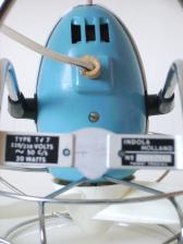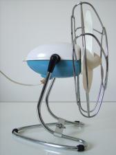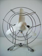 Baujahr: ca. 1950 Breite: ca. 19 cm, Tiefe: ca. 16 cm, Höhe: ca. 23 cm Flügeldurchmesser: ca. 16 cm, Gewicht: ca. 0,87 kg Spannung: 220/230 V, Leistung: 20 W, Stufen: 1 Gehäusematerial: Motorgehäuse aus weiß-blauem Plastik; Ständer und Schutzkäfig aus verchromtem Metall Bemerkung: Kleiner und schöner Ventilator |