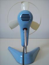 Baujahr: ca. 1959 Breite: ca. 19 cm, Tiefe: ca. 17,5 cm, Höhe: ca. 28,5 cm Flügeldurchmesser: ca. 19 cm, Gewicht: 0,93 kg Spannung: 220 V, Leistung: 25 W, Stufen: 2 Gehäusematerial: Motorgehäuse und Fuß aus schwarzem Kunststoff, Ständer aus Aluminium Bemerkung: 7020 4 Typ 1-1-1 Blau |