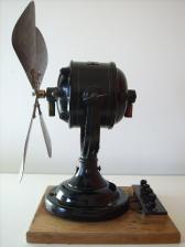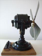 Baujahr: ca. 1920? Breite: ca. 35 cm, Tiefe: ca. 20 cm, Höhe: ca. 42 cm Flügeldurchmesser: ca. 35 cm, Gewicht: ca. 7,2 kg Spannung: 220 V Gehäusematerial: Motorgehäuse und Ständer schwarz lackiertes Metall mit feinen grünen Streifen Bemerkung: sehr beeindruckender und massiver Ventilator. Leider ohne Schutzkorb und Schalter |