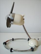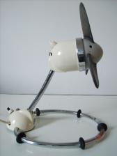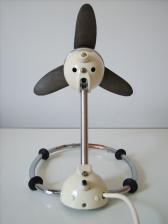 Baujahr: ca. 1950 Breite: ca. 22 cm, Tiefe: ca. 24 cm, Höhe: ca. 30 cm Flügeldurchmesser: ca. 22 cm Spannung: 220 V, Leistung: 30 W, Stufen: 2 Gehäusematerial: Motorgehäuse aus cremefarben lackiertem, Ständer aus verchromtem Metall Bemerkung: Das Modell ist vergleichbar mir dem Modell EV 12 Typ 2. Bei diesem befindet sich neben einem Druckschalter am Fuß ein weiterer Druckschalter am Motorengehäuse. |