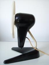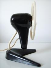 Baujahr: > 1959 Breite: ca. 19 cm, Tiefe: ca. 17,5 cm, Höhe: ca. 29 cm Flügeldurchmesser: ca. 19 cm, Gewicht: 0,94 kg Spannung: 220 V, Leistung: 25 W, Stufen: 2 Gehäusematerial: Motorgehäuse und Fuß aus schwarzem Kunststoff, Ständer aus Aluminium Bemerkung: 7020 4 Typ 1-1-1 Schwarz V1 Designikone! Der Ventilator wurde 1959 von dem Designer Hans Merz entworfen. Der Ventilator ist ein interessantes Beispiel für das Industriedesign der früheren DDR. Der Ventilator kann sowohl als Stand- als auch als Wandventilator verwendet werden. Der Ventilator wurde über einen längeren Herstellungszeitraum, nahezu unverändert, in zahlreichen Varianten produziert. Bisher bekannte Varianten: 7020 4 Typ 1-1-1 Blau, Grau, Schwarz, 7020 4 Typ 1-1-1 Schwarz V1, 7020 4 Typ 1-2-2, 7020 4-3 Typ 1-1-3, 7020 4-3 Typ 1-2-3, 7020 4-3 Typ 2-2-3, 7020 4-3 Typ 2-2-4. Bei der Typenbezeichnung handelt es sich um eine Zahlenkombination aus drei Zahlen z. Bsp. Typ 1-2-3 Die erste Zahl bezieht sich auf das Design der Lüftungsöffnungen, die zweite Zahl bezieht sich auf das Rotoren-Design und die dritte Zahl gibt Auskunft über das verwendete Typenschild. Merkmale 7020 4 Typ 1-1-1 Schwarz V1: 1. Zahl = Lüftungsöffnungen: Kenn-Nr.: 1: Innerhalb einer Kreisfläche befinden sich mehrere parallel zueinander angeordnete, durchgehend gerade Lüftungsschlitze. 2. Zahl = Rotordesign: Kenn-Nr.: 1. Um Verletzungen vorzubeugen, hat der Rotor einen umlaufenden Schutzring, der Teil des Rotors ist. 3. Zahl = Typenschild: Kenn-Nr.: 1. Auf dem Typenschild befindet sich das Omega-Logo. Dieses Logo geht auf die elsässische Firma Omega zurück, die 1908 mitsamt den dazugehörigen Markenrechten von der Firma H.A. Köhlers Söhne Metallwarenfabrik Altenburg übernommen wurde. Die Firma H.A. Köhlers Söhne Metallwarenfabrik Altenburg wurde 1950 zum Volkseigen Betrieb VEB Elektrowärme Altenburg verstaatlicht. 4. Farbe: schwarzer Kunststoff 5. Ständer: cremefarbig lackiertes, gebogenes Aluminiumrohr mit einem Fuß aus schwarzem Kunststoff. Anmerkung: Speziell die Ventilatoren vom Typ 1-1-1 sind gesuchte Sammlerstücke, da diese direkt dem Designer Hans Merz zugeordnet werden können. Die graue Version ist die seltenste Variante gefolgt von Typ 1-1-1 Schwarz V1. |
