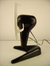 Baujahr: ca. 1960? Breite: ca. 20 cm, Tiefe: ca. 17,5 cm, Höhe: ca. 28,5 cm Flügeldurchmesser: ca. 18,5 cm, Gewicht: 0,98 kg Spannung: 220 V, Leistung: 25 W, Stufen: 2 Gehäusematerial: Motorgehäuse und Fuß aus schwarzem Kunststoff, Ständer aus Aluminium Bemerkung: 7020 4-3 Typ 1-2-3 Designikone! Der Ventilator wurde 1959 von dem Designer Hans Merz entworfen. Der Ventilator ist ein interessantes Beispiel für das Industriedesign der früheren DDR. Der Ventilator kann sowohl als Stand- als auch als Wandventilator verwendet werden. Der Ventilator wurde über einen längeren Herstellungszeitraum, nahezu unverändert, in zahlreichen Varianten produziert. Bisher bekannte Varianten: 7020 4 Typ 1-1-1 Blau, Grau, Schwarz, 7020 4 Typ 1-1-1 Schwarz V1, 7020 4 Typ 1-2-2, 7020 4-3 Typ 1-1-3, 7020 4-3 Typ 1-2-3, 7020 4-3 Typ 2-2-3, 7020 4-3 Typ 2-2-4. Bei der Typenbezeichnung handelt es sich um eine Zahlenkombination aus drei Zahlen z. Bsp. Typ 1-2-3 Die erste Zahl bezieht sich auf das Design der Lüftungsöffnungen, die zweite Zahl bezieht sich auf das Rotoren-Design und die dritte Zahl gibt Auskunft über das verwendete Typenschild Merkmale 7020 4-3 Typ 1-2-3: 1. Zahl = Lüftungsöffnungen: Kenn-Nr.: 1: Innerhalb einer Kreisfläche befinden sich mehrere parallel zueinander angeordnete, durchgehend gerade Lüftungsschlitze. 2. Zahl = Rotordesign: Kenn-Nr.:2. Der Rotor besteht aus 3 Flügel. Um Verletzungen vorzubeugen, wird der Rotor durch einen separaten Schutzring umschlossen, der NICHT Teil des Rotors ist. 3. Zahl = Typenschild: Kenn-Nr.: 3. Das Hersteller-Logo besteht aus einem Kreisring der oben, durch einen rechten Winkel und unten, durch einen Zirkel gekreuzt wird. Formal, hat der untere Bereich des Logos, Ähnlichkeit mit einem A. Dieses A kann als Hinweis auf den Hersteller VEB Elektrowärme Altenburg gedeutet werden. Dieses Logo wurde auf zwei unterschiedlichen Typenschildern verwendet (Kenn-Nr. 2 und 3). Das Typenschild Kenn-Nr. 3 ist schmaler aber dafür höher das Typenschild Kenn.-Nr. 2. 4. Farbe: schwarzer Kunststoff 5. Ständer: gebogenes Aluminiumrohr mit einem Fuß aus schwarzem Kunststoff. Anmerkung: Speziell die Ventilatoren vom Typ 1-1-1 sind gesuchte Sammlerstücke, da diese direkt dem Designer Hans Merz zugeordnet werden können. |