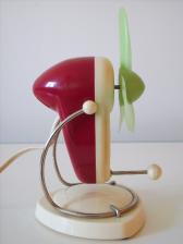 Baujahr: ca. 1960? Breite: ca. 16 cm, Tiefe: ca. 11 cm, Höhe: ca. 21 cm Flügeldurchmesser: ca. 16 cm, Gewicht: ca. 0,65 kg Spannung: 220 V, Leistung: 10 W, Stufen: 2 Gehäusematerial: Motorgehäuse aus rot-weißem Bakelit; Ständer weißer Kunststoff mit verchromtem Metall Bemerkung: Merkmale HA 2728 Weiß-Rot-Grün: Farbe Standfuß: Weiß; Farbe Motorgehäuse hinten: Rot; Flügelfarbe: Grün; Material Drehschalter: aus Metall mit einer Kugel aus Kunststoff am Ende |