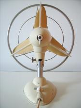 Baujahr: ca. 1950 Breite: ca. 32 cm, Tiefe: ca. 21,5 cm, Höhe: ca. 40 cm Flügeldurchmesser: ca. 30 cm, Gewicht: ca. 3,2 kg Spannung: 110 V, Leistung: 38 W, Stufen: 2 Gehäusematerial: Motorgehäuse und Ständer aus cremefarbig lackiertem Metall. Bemerkung: Merkmale VG 300 P1 C: 1.) Logo: Kennziffer 1 -> erhabenes Logo. Diese Ziffer ist namensgebend für den gesamten Herstellungszeitraum P1; 2.) Schutzkorb: Kennziffer: 1 -> weitmaschiges, verchromtes Schutzgitter mit einem Ring aus poliertem Aluminium. Da alle Ventilatoren während des Herstellungszeitraums P1 einen Schutzkorb mit der Kennziffer 1 haben, kann auf eine Kennzeichnung verzichtet werden; 3.) Rotor: Kennziffer: C. -> Rotor aus cremefarbig lackiertem Bakelit; mit einer Nabe aus Aluminium. 4.) Schalter für den Schwenkmechanismus und die Geschwindigkeitsregulierung cremefarben. 5.) Neigungseinstellung: erfolgt mit Hilfe einer Rändelschraube. 6.) Bemerkung: Von der VG 300 P1-Baureihe sind bisher zwei Varianten bekannt. Eine Variante mit braunem Bakelit-Rotor und braunen Bakelit-Schaltern (VW300 P1 B) und eine Variante mit cremefarbigem Rotor und cremefarbigen Bakelit-Schaltern (VW300 P1 C). ACHTUNG: Die Ventilatoren haben Gleichstrommotoren, weshalb der Betrieb bei Wechselstrom zur Beschädigung führen kann. Hersteller-Nummer: 876108 Bei den Ventilatoren der VG 300-Baureihe handelt es sich um Ventilatoren mit Neigungseinstellung und automatischem Schwenkmechanismus. Die Bezeichnung VG steht wahrscheinlich für Ventilator Gleichstrom. Die Ventilatoren der VG 300-Baureihe unterscheidet sich von denen der VW 300-Baureihe durch die beiden, gut sichtbaren Stromabnehmer, die sich vorne, seitlich am Motorgehäuse, direkt hinter den Flügeln befinden. Bisher sind 6 Varianten der VG 300 Baureihe bekannt (VG 300 P1 B, VG 300 P1 C, VG 300 P2 2 C, VG 300 P2 3 B, VG 300 P2 3 C, VG 300 P3). Die Kennzeichnung der einzelnen Varianten der VG 300-Baureihe erfolgt anhand folgender Kriterien: Die Abkürzung P steht für Phase oder Herstellungszeitraum. Die erste Zahl nach dem P beschreibt die Verwendung eines bestimmten Logos zum Herstellungszeitpunkt. Man unterscheidet dabei drei Herstellungsphasen und zwei unterschiedliche Logos. In Phase 1 haben alle Ventilatoren ein erhabenes Logo. In Phase 2 befindet sich das Herstellerlogo auf einer Kunststofffolie und in Phase 3 besitzen die Ventilatoren kein Logo auf dem Standfuß. Als weiteres Kriterium zur Kennzeichnung der VG 300-Baureihe dienen die, während des gesamten Herstellungszeitraums verwendeten, vier unterschiedlichen Schutzkörbe. Dabei erhält der erste verwendete Schutzkorb die Zahl 1 und der letzte bekannte Schutzkorb die Zahl 4. Die Zahl 1 steht dabei für einen weitmaschigen, verchromten Schutzkorb mit einem Ring aus poliertem Aluminium, die Zahl 2 für einen weitmaschigen, cremefarbigen Schutzkorb mit einem Ring aus poliertem Aluminium, die Zahl 3 für einen engmaschigen, cremefarbigen Schutzkorb mit einem Ring aus poliertem Aluminium und die Zahl 4 für einen Schutzkorb neuester Bauweise, mit engmaschigen, cremefarbigen Schutzkorb OHNE einen Ring aus poliertem Aluminium. In den Zeiträumen, in denen nur ein spezieller Schutzkorb verwendet wurde, wie z. B. in Herstellungszeitraum P1 oder P4 wurde auf eine Kennzeichnung verzichtet. Als weiteres wichtiges Kriterium zur Beschreibung der VG- bzw. VW-Baureihe ist die Farbe bzw. die Beschaffenheit der verwendeten Rotoren und Schalter. Der Buchstabe B beschreibt einen braunen Rotor aus Bakelit, der Buchstabe C weist auf einen cremefarbigen Rotor hin und mit dem Buchstaben F wird ein flexibler Gummirotor beschrieben ( -> VW 300 P1 F). Innerhalb des Herstellungszeitraumes P1 haben alle Ventilatoren einen weitmaschigen, verchromten Schutzkorb mit einem Ring aus poliertem Aluminium und unterscheiden sich voneinander lediglich in den Farben, bzw. der Beschaffenheit ihrer Rotoren. Bisher kennt man die zwei Varianten von der VG 300-Baureihe die im Herstellungszeitraum P1 hergestellt wurden (VG 300 P1 B und VG 300 P1 C) Während des Herstellungszeitraums P2 wurde mindestens 3 Varianten hergestellt. Zum einen, die Variante VG 300 P2 2 C, mit einem weitmaschigen, cremefarbigen Schutzkorb mit einem Ring aus poliertem Aluminium und einem cremefarbigen Rotor, zum zweiten, die Variante VG 300 P2 3 B, mit einem engmaschigen, cremefarbigen Schutzkorb mit einem Ring aus poliertem Aluminium und braunem Rotor und zum dritten die Variante VG 300 P2 3 C mit einem ebenfalls engmaschigen, cremefarbigen Schutzkorb aber cremefarbenem Rotor. Innerhalb des Herstellungszeitraums P3, gibt es keine weitere Variante. Alle Ventilatoren besitzen den gleichen Schutzkorb neuer Bauweise mit engmaschigem, cremefarbigem Schutzgitter OHNE Ring aus poliertem Aluminium und einen cremefarbigen Rotor.P2; 2.) Schutzkorb: Kennziffer: 2 -> weitmaschiges, cremefarbig lackiertes Schutzgitter mit einem Ring aus poliertem Aluminium; 3.) Rotor: Kennziffer: C. -> Rotor aus cremefarbig lackiertem Bakelit mit einer Nabe aus Aluminium; 4.) Schalter für den Schwenkmechanismus und die Geschwindigkeitsregulierung cremefarben. 5.) Neigungseinstellung: erfolgt mit Hilfe einer Rändelschraube. 6.) Bemerkung: ACHTUNG: Die Ventilatoren haben Gleichstrommotoren, weshalb der Betrieb bei Wechselstrom zur Beschädigung führen kann. Hersteller-Nummern: B197782, B206752 Bei den Ventilatoren der VG 300-Baureihe handelt es sich um Ventilatoren mit Neigungseinstellung und automatischem Schwenkmechanismus. Die Bezeichnung VG steht wahrscheinlich für Ventilator Gleichstrom. Die Ventilatoren der VG 300-Baureihe unterscheidet sich von denen der VW 300-Baureihe durch die beiden, gut sichtbaren Stromabnehmer, die sich vorne, seitlich am Motorgehäuse, direkt hinter den Flügeln befinden. Bisher sind 6 Varianten der VG 300 Baureihe bekannt (VG 300 P1 B, VG 300 P1 C, VG 300 P2 2 C, VG 300 P2 3 B, VG 300 P2 3 C, VG 300 P3). Die Kennzeichnung der einzelnen Varianten der VG 300-Baureihe erfolgt anhand folgender Kriteri