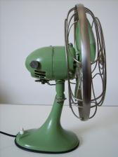 Baujahr: ca. 1950? Breite: ca. 28 cm, Tiefe: ca. 21 cm, Höhe: ca. 35 cm Flügeldurchmesser: ca. 25cm Spannung: 220 V, Stufen: 1 Gehäusematerial: Motorgehäuse und Ständer aus grün lackiertem Metall. Schutzkorb verchromtes Metall Bemerkung: ETO 25 Grün (0,23A) Der ETO 25 ist ein Ventilator mit Gelenk und automatischer Schwenkvorrichtung. 1.) Schwenkmechanismus: Das Getriebe für den automatischen Schwenkmechanismus befindet sich unter einer Abdeckung hinter dem Motorgehäuse. Bei frühen Modellen (Typ 1) befindet sich der Schalter für den automatischen Schwenkmechanismus seitlich, bei späteren Modellen (Typ 2) auf der Abdeckung. 2.) Stromstärke: Von dem ETO 25 sind Varianten mit unterschiedlichen Stromstärken bekannt (0,23A -> Typ 1-1 bzw. Typ 2-1, 0,3A -> Typ 1-2 bzw. Typ 2-2, 0,32A -> Typ 1-3 bzw. Typ 2-3und 0,4A -> Typ 1-4 bzw. 2-4). 3.) Lackierung: Bei den ersten Modellen dieser Baureihe sind der Ständer, das Motorgehäuse, die Getriebeabdeckung und der Rotor grün, bei den späteren Modellen sind nur der Ständer und das Motorgehäuse hellblau oder orange lackiert. Die Getriebeabdeckung und der Rotor sind bei späteren Modellen cremefarbig lackiert. 4.) Rotor: Die Rotoren der frühesten Modelle erscheinen im Vergleich zu den späteren Modellen spiegelverkehrt. Die Abdeckung der Flügelnabe ist bei frühen Modellen aus Aluminium, bei späteren Modellen aus cremefarbig lackiertem Aluminium. Bisher sind folgende Varianten bekannt: ETO 25 Grün (0,23A), ETO 25 Typ 1-1 Blau (0,23A), ET0 25 Typ 1-2 Blau (0,3A), ETO 25 Typ 1-2 Orange (0,3A), ETO 25 Typ 1-3 Blau (0,32A), ETO 25 Typ 1-3 Orange (0,32A), ETO 25 Typ 1-4 Blau (0,4A), ETO 25 Typ 2-2 Blau (0,3A) Merkmale ETO 25 Grün: 1.) Schwenkmechanismus: Typ 1, d.h. der Schalter für den automatischen Schwenkmechanismus befindet sich seitlich an der hinteren Motorabdeckung.2.) Stromstärke: vom ETO 25 in Grün sind bisher nur Modelle mit einer Stromstärke von 0,23 A bekannt 3.) Lackierung: Ständer, Motorgehäuse und Flügel Grün lackiert. 4. Rotor: 4-flügeliger, grün lackierter Rotor. Der Rotor erscheint im Vergleich zu den späteren Modellen spiegelverkehrt. Die Flügelnabe ist aus Aluminium. |