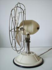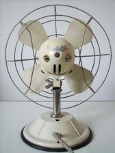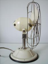 Gehäusematerial: Motorgehäuse und Ständer cremefarben lackiertes Metall. Schutzkorb verchromt