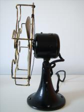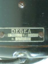 Baujahr: ca. 1930 Breite: ca. 25 cm, Tiefe: ca. 15 cm, Höhe: ca. 31,5 cm Flügeldurchmesser: ca. 21 cm, Gewicht: ca. 1,96 kg Spannung: 220 V, Leistung: 40 W, Stufen: 1 Gehäusematerial: Motorgehäuse und Ständer aus schwarz lackiertem Metall Bemerkung: Bisher sind von der Firma Degea zwei unterschiedliche Gelenkfächer- Typen bekannt, die sich in folgenden Punkten unterscheiden: - Typenschild: Bei Typ 1 ist der gesamte Firmenname großgeschrieben (DEGEA). Bei Typ 2 ist lediglich der Anfangsbuchstabe großgeschrieben (Degea). Bei Typ 1 findet man auf dem Typenschild noch Angaben zur Spannung (V) und die Angaben der Leitung (W) und eine Herstellungsnummer. Bei Typ 2 findet man zusätzlich noch eine Nr., die als Typenbezeichnung gedeutet werden kann (z.B. 571, oder 4122), die ich jedoch als solche nicht verwende, da sich die dazugehörigen Ventilatoren bis ins letzte Detail gleichen. Bauliche Besonderheiten: - Lage der Stromabnehmer: Bei Typ 1 befinden sich die Stromabnehmer am Motorgehäuse hinten, beim Typ 2 vorne. - Lage der Motorabdeckung: Das Motorgehäuse ist bei beiden Typen zweischalig aufgebaut (Motorabdeckung und Motorgehäuse) mit dem Unterschied, dass sich bei Typ 1 die Motorabdeckung hinten am Motorgehäuse und beim Typ 2 vorne am Motorgehäuse befindet. Bei Typ 1 ist durch Motorabdeckung hinten, die Motorwelle nicht sichtbar. Bei Typ 2 ist sowohl das Lager als auch die Welle von hinten gut sichtbar. - Halterungen des Schutzkorbes. Bei Typ 1 sind diese Halterungen gerade und vorne am Motorgehäuse montiert. Bei Typ 2 sind die L-förmig und um das Motorgehäuse herum montiert. - Rotor: bei Typ 1 ist der Rotor aus goldfarbig lackiertem Aluminium, bei Typ 2 aus Messing Bisher bekannt sind mir folgende Typen: Degea Gelenkfächer Typ 1 (35W), Degea Gelenkfächer Typ 1 (40W), Degea Gelenkfächer Typ 2 (35W). Alle Typen haben einen An-/Ausschalter am Standfuß. |