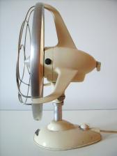 Baujahr: ca. 1950 Breite: ca. 32 cm, Tiefe: ca. 21,5 cm, Höhe: ca. 40 cm Flügeldurchmesser: ca. 30 cm, Gewicht: ca. 3,2 kg Spannung: 110 V, Leistung: 38 W, Stufen: 2 Gehäusematerial: Motorgehäuse und Ständer aus cremefarbig lackiertem Metall. Bemerkung: Merkmale VG 300 P1 C: 1.) Logo: Kennziffer 1 -> erhabenes Logo. Diese Ziffer ist namensgebend für den gesamten Herstellungszeitraum P1; 2.) Schutzkorb: Kennziffer: 1 -> weitmaschiges, verchromtes Schutzgitter mit einem Ring aus poliertem Aluminium. Da alle Ventilatoren während des Herstellungszeitraums P1 einen Schutzkorb mit der Kennziffer 1 haben, kann auf eine Kennzeichnung verzichtet werden; 3.) Rotor: Kennziffer: C. -> Rotor aus cremefarbig lackiertem Bakelit; mit einer Nabe aus Aluminium. 4.) Schalter für den Schwenkmechanismus und die Geschwindigkeitsregulierung cremefarben. 5.) Neigungseinstellung: erfolgt mit Hilfe einer Rändelschraube. 6.) Bemerkung: Von der VG 300 P1-Baureihe sind bisher zwei Varianten bekannt. Eine Variante mit braunem Bakelit-Rotor und braunen Bakelit-Schaltern (VW300 P1 B) und eine Variante mit cremefarbigem Rotor und cremefarbigen Bakelit-Schaltern (VW300 P1 C). ACHTUNG: Die Ventilatoren haben Gleichstrommotoren, weshalb der Betrieb bei Wechselstrom zur Beschädigung führen kann. Hersteller-Nummer: 876108 Bei den Ventilatoren der VG 300-Baureihe handelt es sich um Ventilatoren mit Neigungseinstellung und automatischem Schwenkmechanismus. Die Bezeichnung VG steht wahrscheinlich für Ventilator Gleichstrom. Die Ventilatoren der VG 300-Baureihe unterscheidet sich von denen der VW 300-Baureihe durch die beiden, gut sichtbaren Stromabnehmer, die sich vorne, seitlich am Motorgehäuse, direkt hinter den Flügeln befinden. Bisher sind 6 Varianten der VG 300 Baureihe bekannt (VG 300 P1 B, VG 300 P1 C, VG 300 P2 2 C, VG 300 P2 3 B, VG 300 P2 3 C, VG 300 P3). Die Kennzeichnung der einzelnen Varianten der VG 300-Baureihe erfolgt anhand folgender Kriterien: Die Abkürzung P steht für Phase oder Herstellungszeitraum. Die erste Zahl nach dem P beschreibt die Verwendung eines bestimmten Logos zum Herstellungszeitpunkt. Man unterscheidet dabei drei Herstellungsphasen und zwei unterschiedliche Logos. In Phase 1 haben alle Ventilatoren ein erhabenes Logo. In Phase 2 befindet sich das Herstellerlogo auf einer Kunststofffolie und in Phase 3 besitzen die Ventilatoren kein Logo auf dem Standfuß. Als weiteres Kriterium zur Kennzeichnung der VG 300-Baureihe dienen die, während des gesamten Herstellungszeitraums verwendeten, vier unterschiedlichen Schutzkörbe. Dabei erhält der erste verwendete Schutzkorb die Zahl 1 und der letzte bekannte Schutzkorb die Zahl 4. Die Zahl 1 steht dabei für einen weitmaschigen, verchromten Schutzkorb mit einem Ring aus poliertem Aluminium, die Zahl 2 für einen weitmaschigen, cremefarbigen Schutzkorb mit einem Ring aus poliertem Aluminium, die Zahl 3 für einen engmaschigen, cremefarbigen Schutzkorb mit einem Ring aus poliertem Aluminium und die Zahl 4 für einen Schutzkorb neuester Bauweise, mit engmaschigen, cremefarbigen Schutzkorb OHNE einen Ring aus poliertem Aluminium. In den Zeiträumen, in denen nur ein spezieller Schutzkorb verwendet wurde, wie z. B. in Herstellungszeitraum P1 oder P4 wurde auf eine Kennzeichnung verzichtet. Als weiteres wichtiges Kriterium zur Beschreibung der VG- bzw. VW-Baureihe ist die Farbe bzw. die Beschaffenheit der verwendeten Rotoren und Schalter. Der Buchstabe B beschreibt einen braunen Rotor aus Bakelit, der Buchstabe C weist auf einen cremefarbigen Rotor hin und mit dem Buchstaben F wird ein flexibler Gummirotor beschrieben ( -> VW 300 P1 F). Innerhalb des Herstellungszeitraumes P1 haben alle Ventilatoren einen weitmaschigen, verchromten Schutzkorb mit einem Ring aus poliertem Aluminium und unterscheiden sich voneinander lediglich in den Farben, bzw. der Beschaffenheit ihrer Rotoren. Bisher kennt man die zwei Varianten von der VG 300-Baureihe die im Herstellungszeitraum P1 hergestellt wurden (VG 300 P1 B und VG 300 P1 C) Während des Herstellungszeitraums P2 wurde mindestens 3 Varianten hergestellt. Zum einen, die Variante VG 300 P2 2 C, mit einem weitmaschigen, cremefarbigen Schutzkorb mit einem Ring aus poliertem Aluminium und einem cremefarbigen Rotor, zum zweiten, die Variante VG 300 P2 3 B, mit einem engmaschigen, cremefarbigen Schutzkorb mit einem Ring aus poliertem Aluminium und braunem Rotor und zum dritten die Variante VG 300 P2 3 C mit einem ebenfalls engmaschigen, cremefarbigen Schutzkorb aber cremefarbenem Rotor. Innerhalb des Herstellungszeitraums P3, gibt es keine weitere Variante. Alle Ventilatoren besitzen den gleichen Schutzkorb neuer Bauweise mit engmaschigem, cremefarbigem Schutzgitter OHNE Ring aus poliertem Aluminium und einen cremefarbigen Rotor.P2; 2.) Schutzkorb: Kennziffer: 2 -> weitmaschiges, cremefarbig lackiertes Schutzgitter mit einem Ring aus poliertem Aluminium; 3.) Rotor: Kennziffer: C. -> Rotor aus cremefarbig lackiertem Bakelit mit einer Nabe aus Aluminium; 4.) Schalter für den Schwenkmechanismus und die Geschwindigkeitsregulierung cremefarben. 5.) Neigungseinstellung: erfolgt mit Hilfe einer Rändelschraube. 6.) Bemerkung: ACHTUNG: Die Ventilatoren haben Gleichstrommotoren, weshalb der Betrieb bei Wechselstrom zur Beschädigung führen kann. Hersteller-Nummern: B197782, B206752 Bei den Ventilatoren der VG 300-Baureihe handelt es sich um Ventilatoren mit Neigungseinstellung und automatischem Schwenkmechanismus. Die Bezeichnung VG steht wahrscheinlich für Ventilator Gleichstrom. Die Ventilatoren der VG 300-Baureihe unterscheidet sich von denen der VW 300-Baureihe durch die beiden, gut sichtbaren Stromabnehmer, die sich vorne, seitlich am Motorgehäuse, direkt hinter den Flügeln befinden. Bisher sind 6 Varianten der VG 300 Baureihe bekannt (VG 300 P1 B, VG 300 P1 C, VG 300 P2 2 C, VG 300 P2 3 B, VG 300 P2 3 C, VG 300 P3). Die Kennzeichnung der einzelnen Varianten der VG 300-Baureihe erfolgt anhand folgender Kriteri