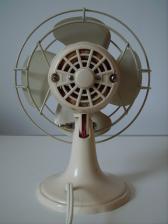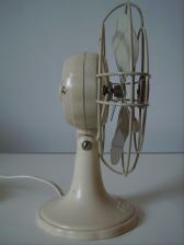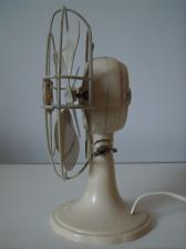 Baujahr: ca. 1950 Breite: 18 cm, Tiefe: 11,5 cm, Höhe: 23,5 cm Flügeldurchmesser: 16 cm, Gewicht: 1,6 kg Spannung: 220 V, Leistung: 35 W, Stufen: 1 Gehäusematerial: Motorgehäuse und Ständer aus cremefarbenem Bakelit. Schutzkorb creme-farbig lackiertes Metall Bemerkung: Merkmale Typ 7: Bronze-farbig hinterlegtes Firmenlogo. Der Firmenname besitzt nur am Anfang einen Grossbuchstaben "Calor". Oberhalb und unterhalb des Firmennamens befinden sich jeweils 7 Kreisbögen. |