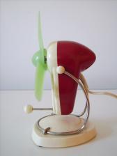 Baujahr: ca. 1960? Breite: ca. 16 cm, Tiefe: ca. 11 cm, Höhe: ca. 21 cm Flügeldurchmesser: ca. 16 cm, Gewicht: ca. 0,65 kg Spannung: 220 V, Leistung: 10 W, Stufen: 2 Gehäusematerial: Motorgehäuse aus rot-weißem Bakelit; Ständer weißer Kunststoff mit verchromtem Metall Bemerkung: Merkmale HA 2728 Weiß-Rot-Grün: Farbe Standfuß: Weiß; Farbe Motorgehäuse hinten: Rot; Flügelfarbe: Grün; Material Drehschalter: aus Metall mit einer Kugel aus Kunststoff am Ende |