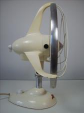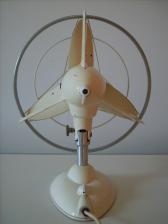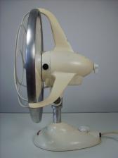 Baujahr: ca. 1950 Breite: ca. 32 cm, Tiefe: ca. 21,5 cm, Höhe: ca. 40 cm Flügeldurchmesser: ca. 30 cm, Gewicht: ca. 3,2 kg Spannung: 110 V, Leistung: 38 W, Stufen: 2 Gehäusematerial: Motorgehäuse und Ständer aus cremefarbig lackiertem Metall. Bemerkung: Merkmale VG 300 P2 2 C: 1.) Logo: Kennziffer 2 -> Das Logo befindet sich auf einer Kunststofffolie. Diese Ziffer ist namensgebend für den gesamten Herstellungszeitraum P2; 2.) Schutzkorb: Kennziffer: 2 -> weitmaschiges, cremefarbig lackiertes Schutzgitter mit einem Ring aus poliertem Aluminium; 3.) Rotor: Kennziffer: C. -> Rotor aus cremefarbig lackiertem Bakelit mit einer Nabe aus Aluminium; 4.) Schalter für den Schwenkmechanismus und die Geschwindigkeitsregulierung cremefarben. 5.) Neigungseinstellung: erfolgt mit Hilfe einer Rändelschraube. 6.) Bemerkung: ACHTUNG: Die Ventilatoren haben Gleichstrommotoren, weshalb der Betrieb bei Wechselstrom zur Beschädigung führen kann. Hersteller-Nummern: B197782, B206752 Bei den Ventilatoren der VG 300-Baureihe handelt es sich um Ventilatoren mit Neigungseinstellung und automatischem Schwenkmechanismus. Die Bezeichnung VG steht wahrscheinlich für Ventilator Gleichstrom. Die Ventilatoren der VG 300-Baureihe unterscheidet sich von denen der VW 300-Baureihe durch die beiden, gut sichtbaren Stromabnehmer, die sich vorne, seitlich am Motorgehäuse, direkt hinter den Flügeln befinden. Bisher sind 6 Varianten der VG 300 Baureihe bekannt (VG 300 P1 B, VG 300 P1 C, VG 300 P2 2 C, VG 300 P2 3 B, VG 300 P2 3 C, VG 300 P3). Die Kennzeichnung der einzelnen Varianten der VG 300-Baureihe erfolgt anhand folgender Kriterien: Die Abkürzung P steht für Phase oder Herstellungszeitraum. Die erste Zahl nach dem P beschreibt die Verwendung eines bestimmten Logos zum Herstellungszeitpunkt. Man unterscheidet dabei drei Herstellungsphasen und zwei unterschiedliche Logos. In Phase 1 haben alle Ventilatoren ein erhabenes Logo. In Phase 2 befindet sich das Herstellerlogo auf einer Kunststofffolie und in Phase 3 besitzen die Ventilatoren kein Logo auf dem Standfuß. Als weiteres Kriterium zur Kennzeichnung der VG 300-Baureihe dienen die, während des gesamten Herstellungszeitraums verwendeten, vier unterschiedlichen Schutzkörbe. Dabei erhält der erste verwendete Schutzkorb die Zahl 1 und der letzte bekannte Schutzkorb die Zahl 4. Die Zahl 1 steht dabei für einen weitmaschigen, verchromten Schutzkorb mit einem Ring aus poliertem Aluminium, die Zahl 2 für einen weitmaschigen, cremefarbigen Schutzkorb mit einem Ring aus poliertem Aluminium, die Zahl 3 für einen engmaschigen, cremefarbigen Schutzkorb mit einem Ring aus poliertem Aluminium und die Zahl 4 für einen Schutzkorb neuester Bauweise, mit engmaschigen, cremefarbigen Schutzkorb OHNE einen Ring aus poliertem Aluminium. In den Zeiträumen, in denen nur ein spezieller Schutzkorb verwendet wurde, wie z. B. in Herstellungszeitraum P1 oder P4 wurde auf eine Kennzeichnung verzichtet. Als weiteres wichtiges Kriterium zur Beschreibung der VG- bzw. VW-Baureihe ist die Farbe bzw. die Beschaffenheit der verwendeten Rotoren und Schalter. Der Buchstabe B beschreibt einen braunen Rotor aus Bakelit, der Buchstabe C weist auf einen cremefarbigen Rotor hin und mit dem Buchstaben F wird ein flexibler Gummirotor beschrieben ( -> VW 300 P1 F). Innerhalb des Herstellungszeitraumes P1 haben alle Ventilatoren einen weitmaschigen, verchromten Schutzkorb mit einem Ring aus poliertem Aluminium und unterscheiden sich voneinander lediglich in den Farben, bzw. der Beschaffenheit ihrer Rotoren. Bisher kennt man die zwei Varianten von der VG 300-Baureihe die im Herstellungszeitraum P1 hergestellt wurden (VG 300 P1 B und VG 300 P1 C) Während des Herstellungszeitraums P2 wurde mindestens 3 Varianten hergestellt. Zum einen, die Variante VG 300 P2 2 C, mit einem weitmaschigen, cremefarbigen Schutzkorb mit einem Ring aus poliertem Aluminium und einem cremefarbigen Rotor, zum zweiten, die Variante VG 300 P2 3 B, mit einem engmaschigen, cremefarbigen Schutzkorb mit einem Ring aus poliertem Aluminium und braunem Rotor und zum dritten die Variante VG 300 P2 3 C mit einem ebenfalls engmaschigen, cremefarbigen Schutzkorb aber cremefarbenem Rotor. Innerhalb des Herstellungszeitraums P3, gibt es keine weitere Variante. Alle Ventilatoren besitzen den gleichen Schutzkorb neuer Bauweise mit engmaschigem, cremefarbigem Schutzgitter OHNE Ring aus poliertem Aluminium und einen cremefarbigen Rotor.01L |