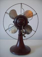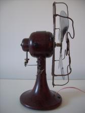 Baujahr: ca. 1932 Breite: ca. 33 cm, Tiefe: ca. 19 cm, Höhe: ca. 41 cm Flügeldurchmesser: ca. 30 cm, Gewicht: ca. 3,3 kg Spannung: 120/125/130 V, Leistung: 55 W, Stufen: 1 Gehäusematerial: Motorgehäuse und Ständer aus rötlichbraunem Bakelit. Schutzkorb verchromtes Metall Bemerkung: seltener und sammelwürdiger Ventilator. |