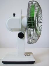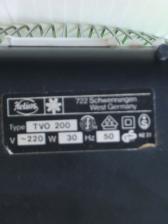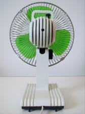 Baujahr: 1979 Breite: ca. 23 cm, Tiefe: ca. 19 cm, Höhe: 33 cm Flügeldurchmesser: 20 cm, Gewicht: 1,2 kg Spannung: 220 V, Leistung: 30 W, Stufen: 2 Gehäusematerial: Motorgehäuse und Ständer aus weißem Kunststoff. Schutzgitter verchromtes Metall Bemerkung: Bei den Ventilatoren der TVO-Baureihe handelt es sich um oszillierende Tisch-Wandventilatoren. Bisher sind von der TVO-Baureihe 6 verschiedene Typen mit mindestens 10 verschiedene Varianten bekannt. TVO 20, TVO 25, TVO 30, TVO 200 Typ 1 und Typ 2, TVO 250 Typ 1 und Typ 2 und TVO 300 Typ 1, Typ 2 und Typ 3. Vermutlich existieren auch die Typen TVO 200 Typ 3 und TVO 250 Typ 3. Während es von Typen TVO 20, 25 und TVO 30 keine weiteren Varianten gibt, existieren bekannt, von den Typen TVO 200, 250 und 300 vermutlich jeweils 3-Varianten (Typ 1, Typ 2 und Typ 3).Man kann davon ausgehen, dass der TVO 20 durch den TVO 200 Typ 1, der TVO 25 durch den TVO 250 Typ 1 und der TVO 30 durch den TVO 300 Typ 1 ersetzt wurde, da sich das Design der Schutzkörbe gleicht. Die Typen 2 und 3 besitzen den gleichen Schutzkorb mit Rauten-Gitter. Sie unterscheiden sich jedoch in der Farbe der Rotorflügel (Typ 2 =grün, Typ 3 = blau). |