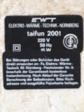 Bemerkung: Relativ selten. Baugleich mit dem Typ "Taifun 2000", des gleichen Herstellers bzw. baugeich mit dem Typ "Taifun 2002" des Herstellers Privileg und mit dem Typ "FN2000" des Herstellers Indola. Der Ventilator wurde auch über Neckermann vertrieben. Typischer Ventilator seiner Zeit. Siehe auch Ventilatoren dieser Zeit der Hersteller Helios oder Cora
